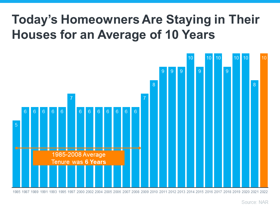 Today, homeowners are living in their houses longer. According to the National Association of Realtors (NAR), since 1985, the average time a homeowner has owned their home has increased from 5 to 10 years (see graph below):