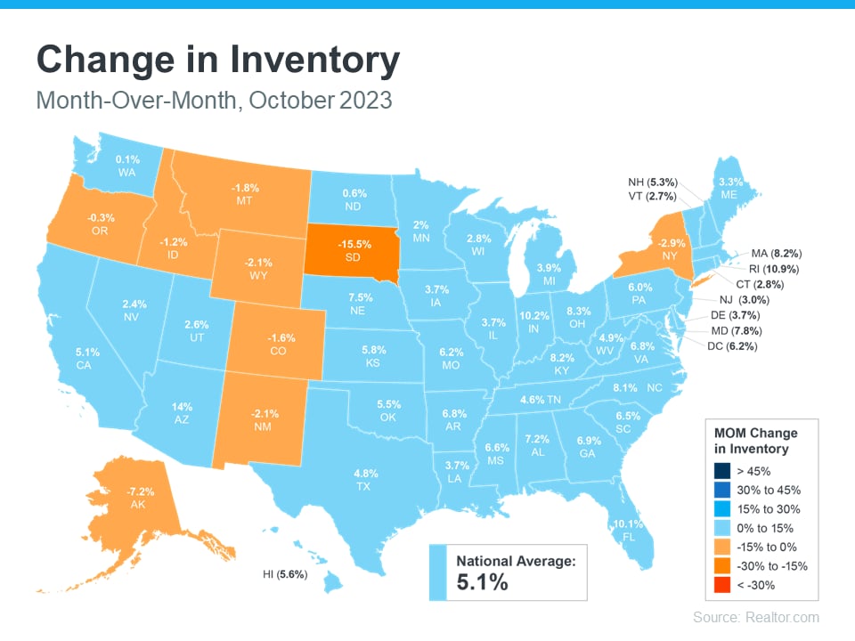 While the story for the past few years has been how few homes are on the market, recent national data may leave you feeling a bit confused. That’s because Realtor.com shows inventory is actually growing a bit month-over-month in many parts of the country (see the blue states in the map below):