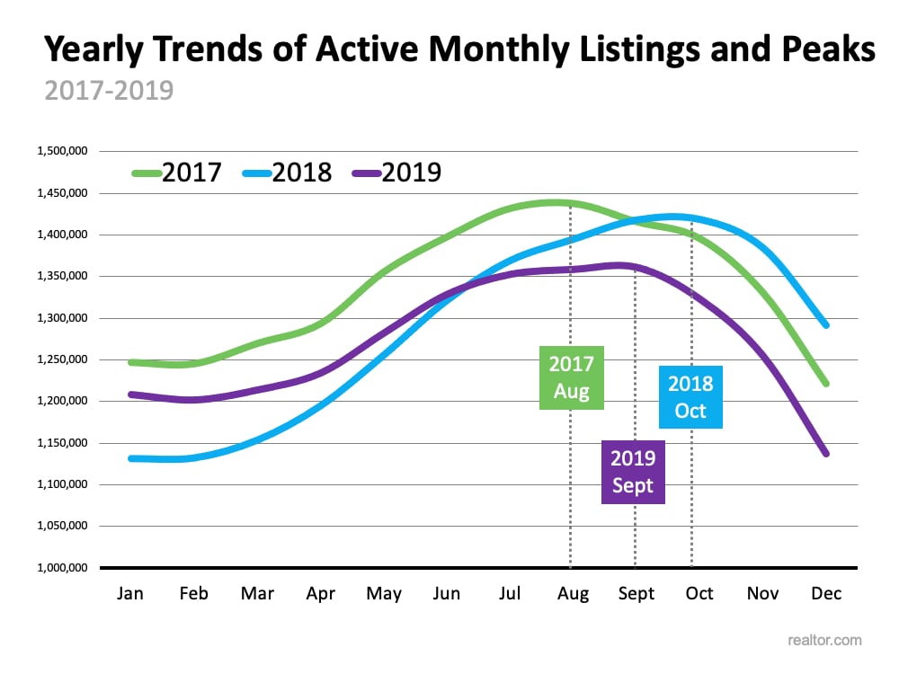 Historically, housing inventory increases throughout the summer months, starts to tail off in the fall, and then drops significantly over the winter. The graph below shows this trend along with the month active listings peaked in 2017, 2018, and 2019.
