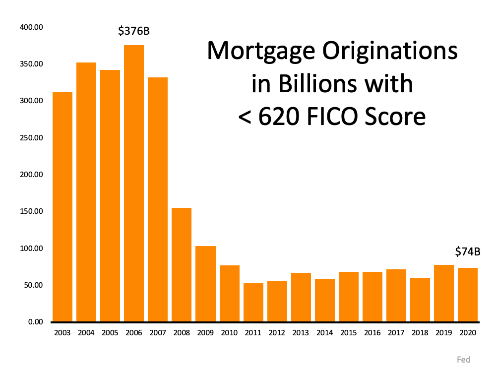 In 2006, mortgage entities originated $376 billion dollars in loans for purchasers with a score under 620. Last year, that number was only $74 billion.