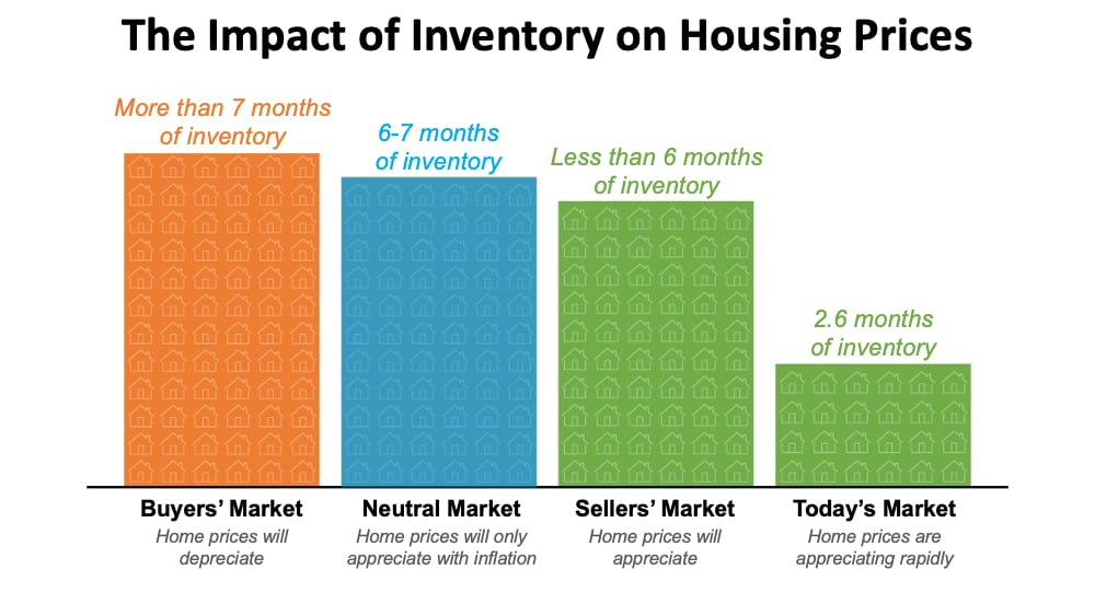 It starts with the number of houses available for sale. The latest Existing Home Sales Report from the National Association of Realtors (NAR) shows housing supply is still astonishingly low. Today, we have a 2.6-month supply of homes at the current sales pace. Historically, a 6-month supply is necessary for a ‘normal’ or ‘neutral’ market in which there are enough homes available for active buyers (see graph below):