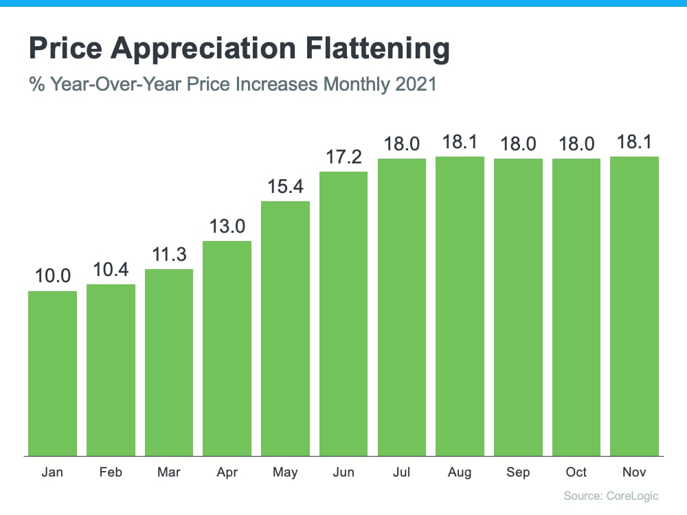 After almost two years of double-digit increases, many experts thought home price appreciation would decelerate or happen at a slower pace in the last quarter of 2021. However, the latest Home Price Insights Report from CoreLogic indicates while prices may have plateaued, appreciation has definitely not slowed. The following graph shows year-over-year appreciation throughout 2021. December data has not yet been released.