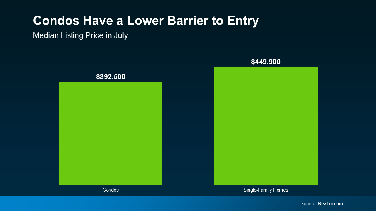 Since they're usually smaller than single-family homes, they can be easier on your wallet. While it’s not always the case, smaller square footage usually comes with a smaller price tag too. As a result, according to the latest data from Realtor.com, condos typically have a lower asking price than single-family homes (see graph below):