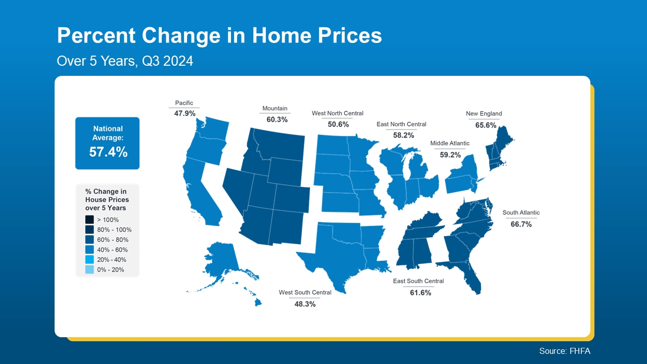 The map below uses data from the Federal Housing Finance Agency (FHFA) to show how much prices have grown over the last five years. Since home prices vary by area, the map is broken out regionally to really showcase larger market trends: