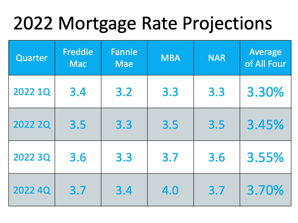 “Right now, we forecast mortgage rates to average 3.3 percent in 2022, which, though slightly higher than 2020 and 2021, by historical standards remains extremely low . . .”
